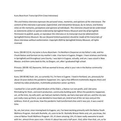This Oral History interview expresses the personal views, memories, and opinions of the interviewee. The content of this interview is personal, experiential, and interpretive because, by its nature, oral history relies on the memories, perceptions and opinions of individuals. This interview should not be understood as statements of fact or opinion endorsed by the Springfield History Museum, City of Springfield, or sponsors. Permission to publish, quote, or reproduce this interview or its transcript must be obtained from Springfield History Museum. No use (beyond limited quotation) should be made of the transcripts of these interviews without authorization. Copyright 2024 by Springfield History Museum, All Rights Reserved. For all other uses please contact springfieldmuseum@springfield-or.gov.