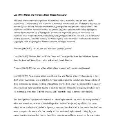 This oral history interview with Leo White Horse was conducted by Princess Bass-Mason at LCC Longhouse, in one session during 2024, as part of the Springfield History Museum's Oral History Project "ILLUMINATION 2024-25: Indigenous AI AN Experience". Transcript in English.