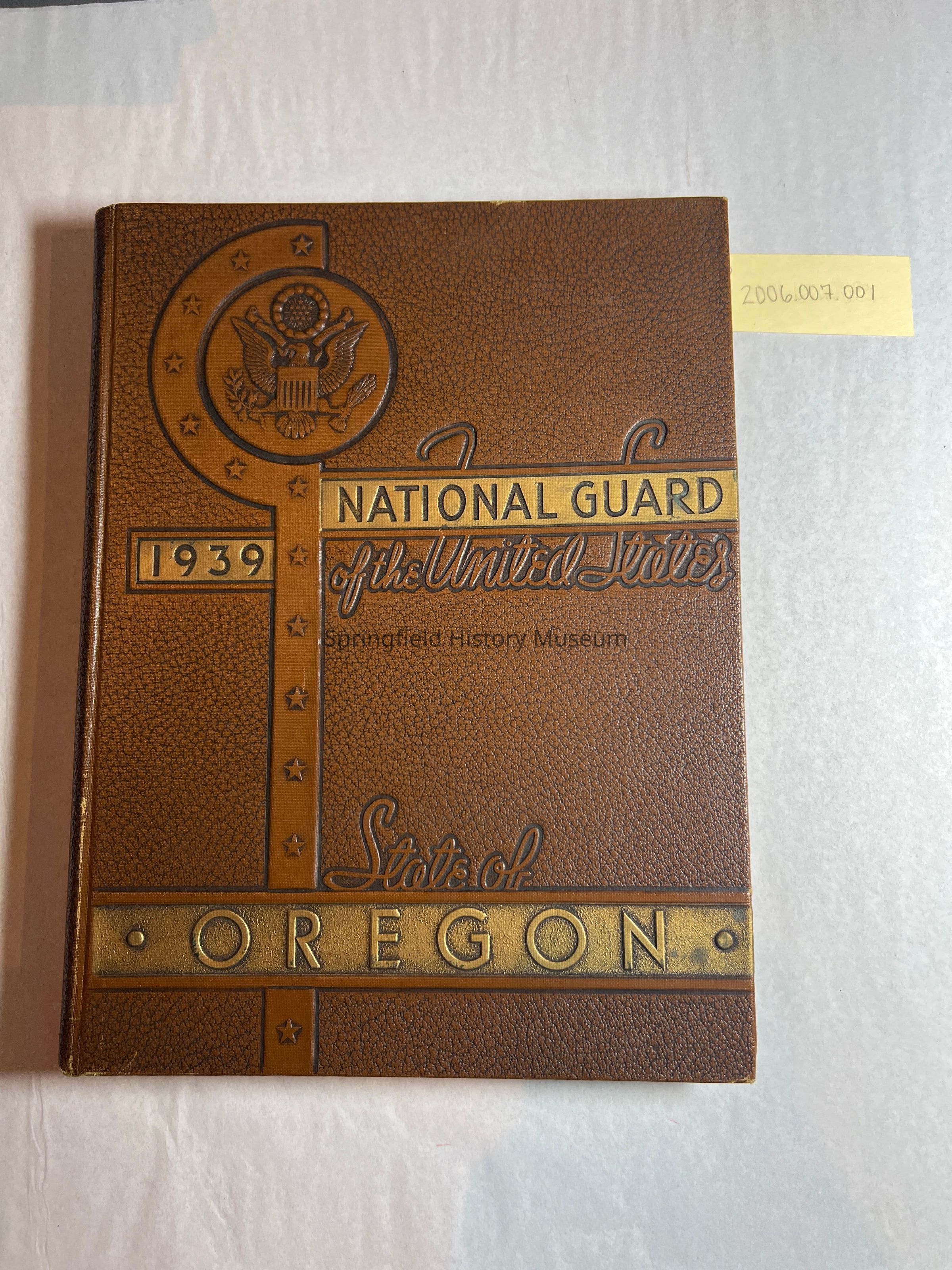 1939 Oregon National Guard yearbook, hardbound, belonged to Sargeant Walter Shull. Signed inside: 1st Lieutenant Charles A Swarts, Sgt Joe Gerber, Sgt Everett Squires, Sgt Richard Whittington, and Sgt Brad Squires. Book lists units with photos. Hardbound