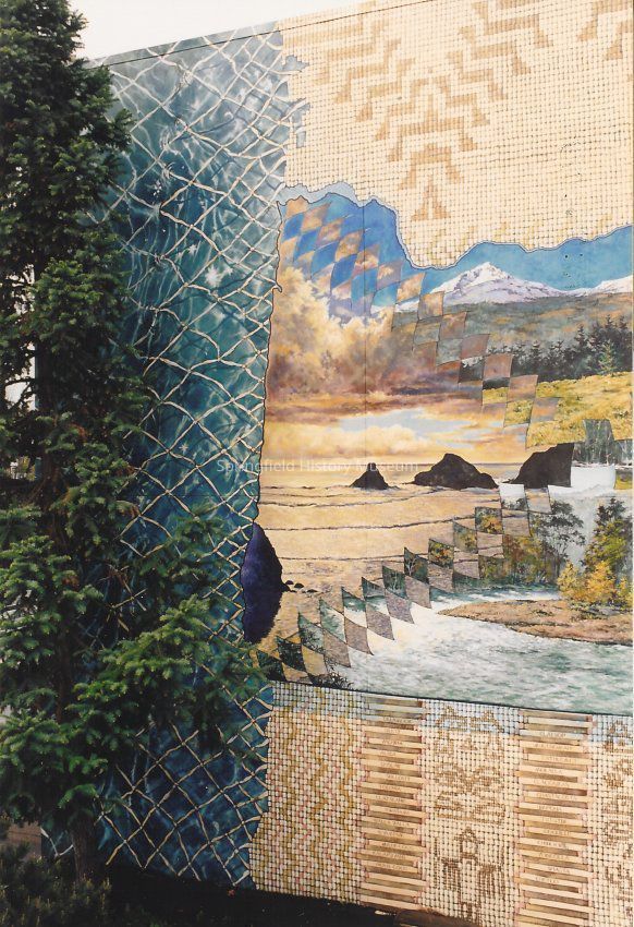 Oregon Trail mural detail from an angle. Painted by Anne Woodruff Murray in 1993 - 1994.