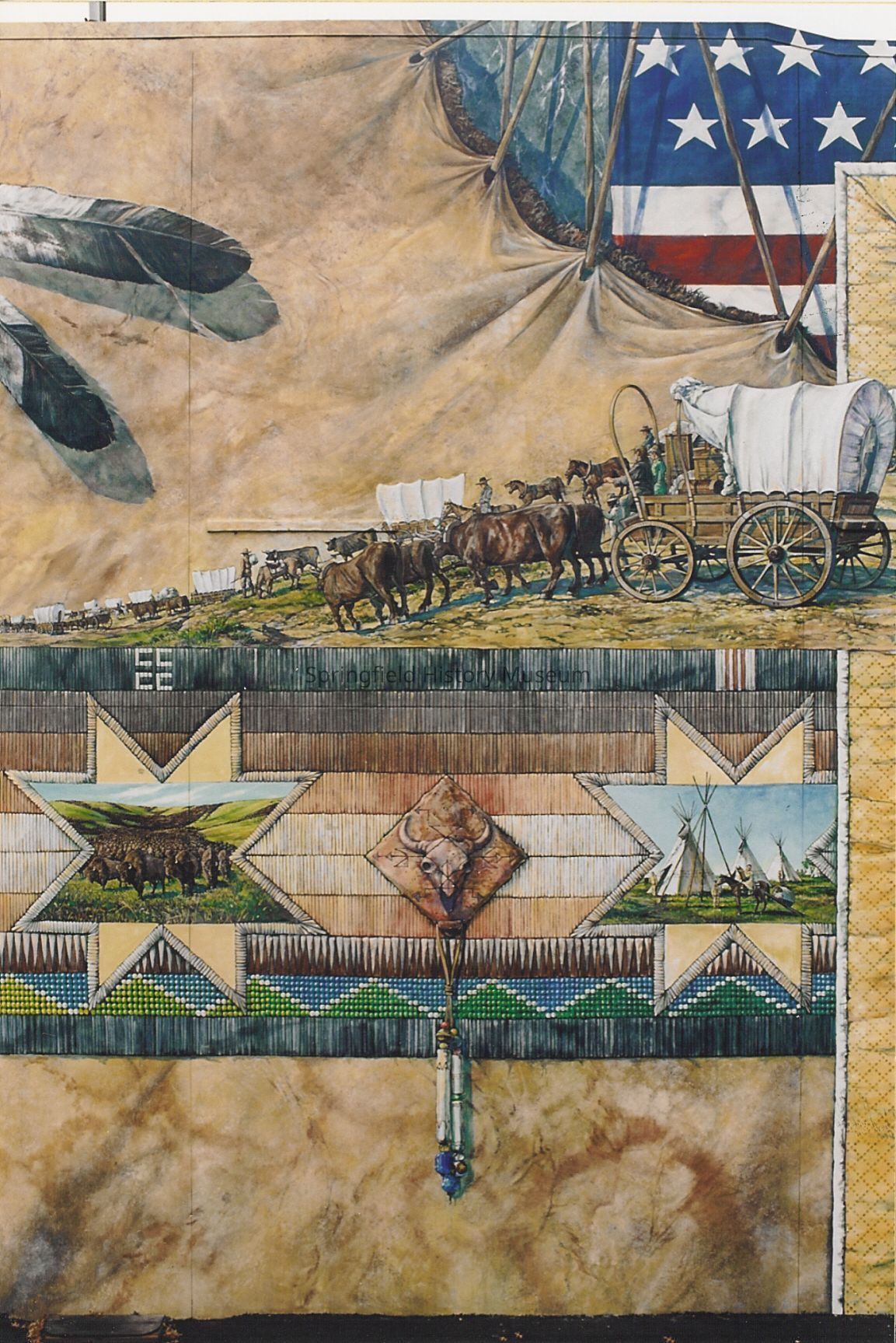 Oregon Trail mural showing the Wagon Train above the porcupine quill belt. Painted by Anne Woodruff Murray in 1993 - 1994.