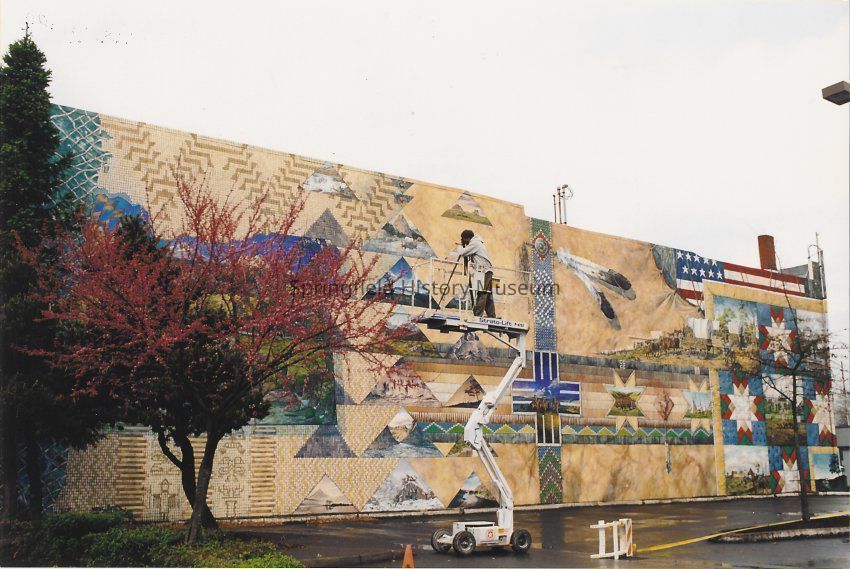Photographer on cherry-picker, in front of Oregon Trail Mural. Painted by Anne Woodruff Murray in 1993 - 1994.