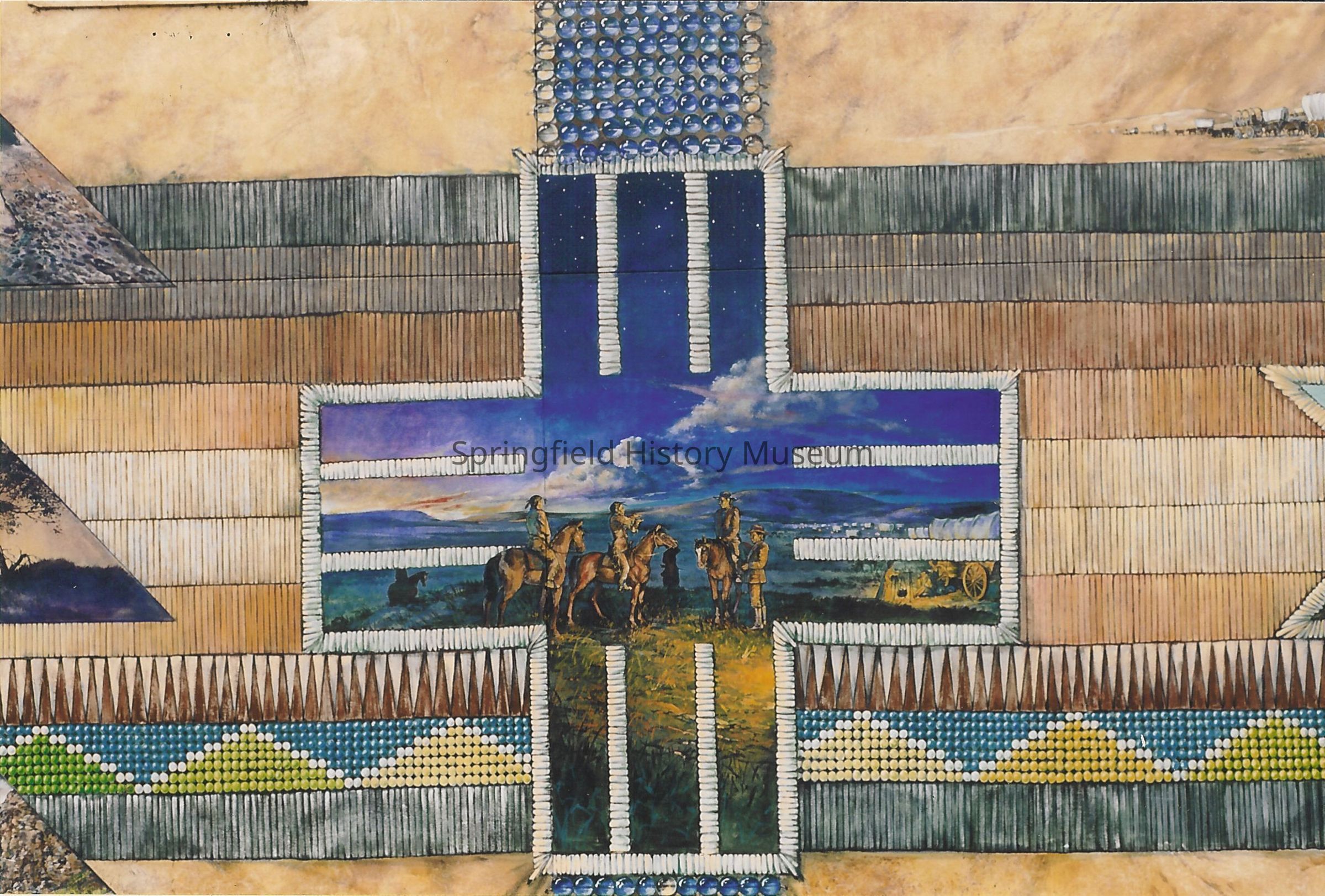 Oregon Trail mural detail of Pioneers meeting Plains Indians about 1843. Painted by Anne Woodruff Murray in 1993 - 1994.
