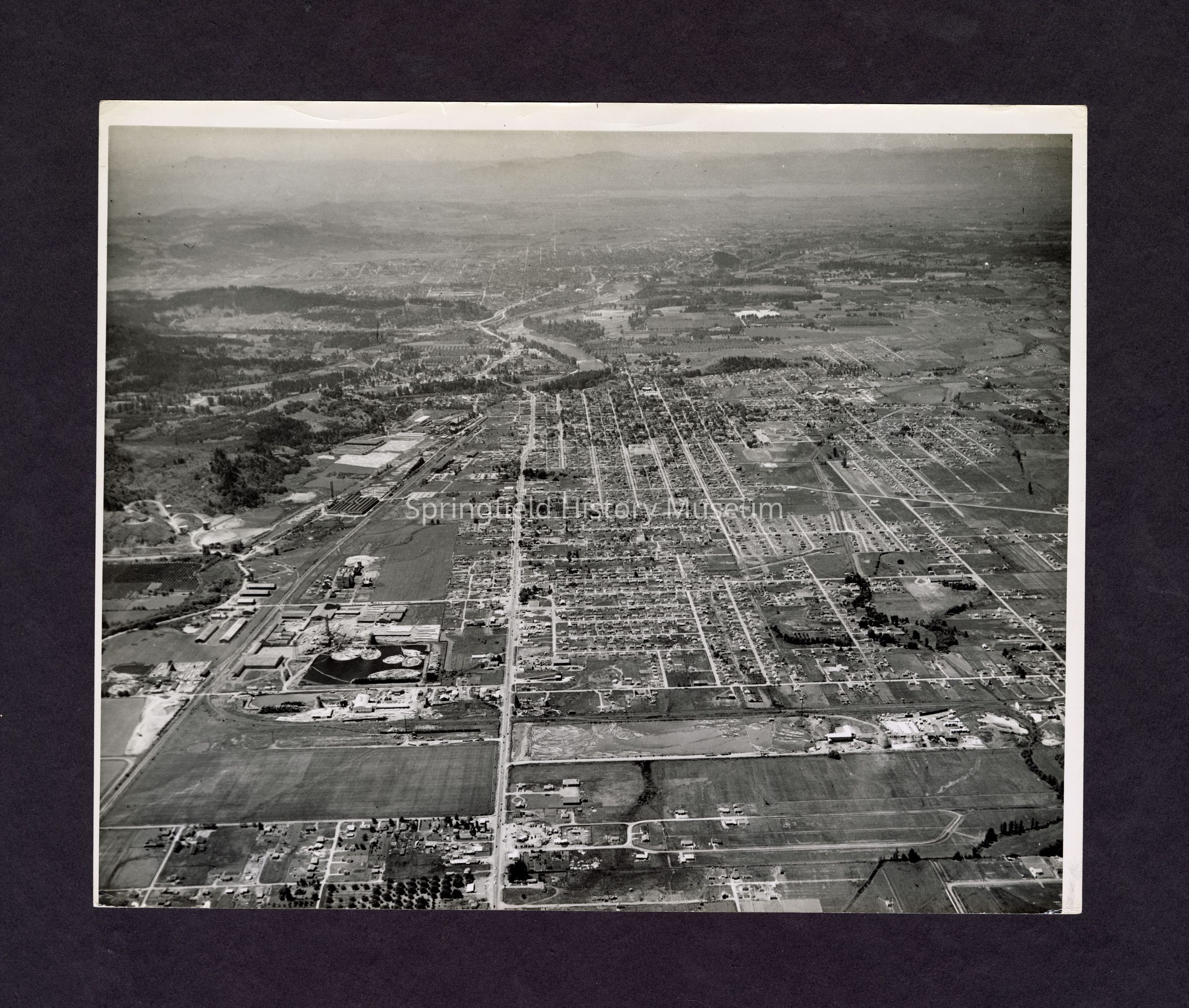 Black and white aerial photograph of Springfield, looking west along Main Street, 32nd in lower left. Rosboro and alcohol plant. Undated. Duplicate of 1995.010.001.Collection