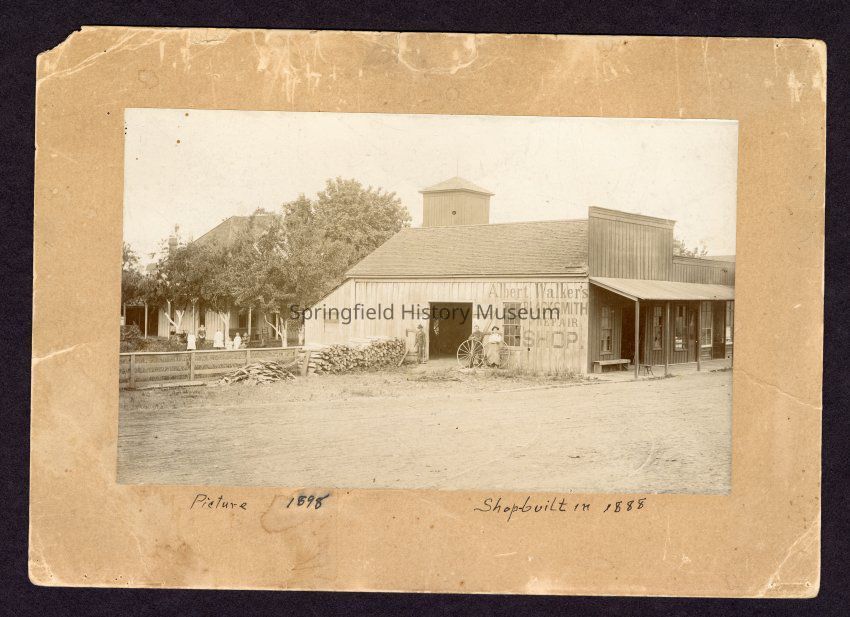 Mounted B&W Photo of Albert Walker's blacksmith shop, built in 1888; taken in 1898. Albert Walker was Springfield's first Mayor in 1885.Photograph Details