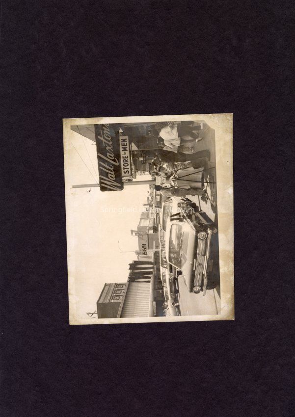 B&W Photo of Crazy Days 1970s. Walt Laxton store for men between 5th and 6th and Main St. Springfield, Oregon.Photograph Details