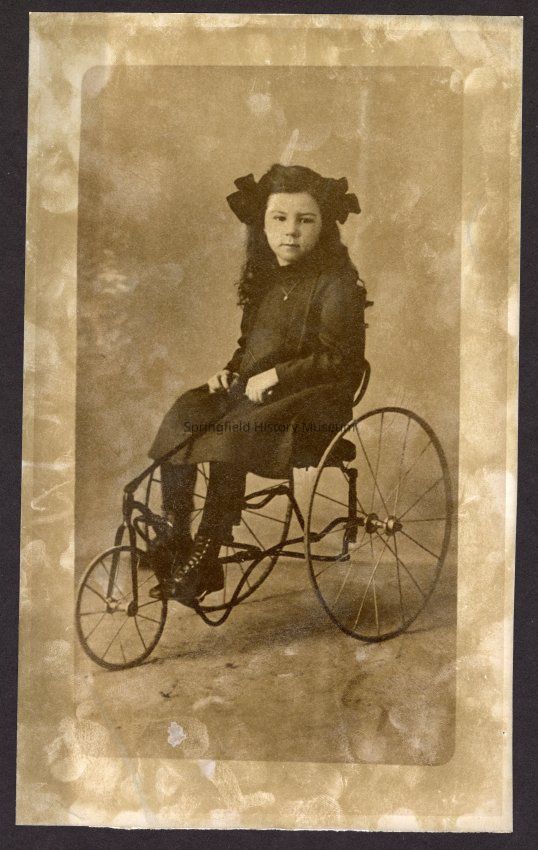 B&W Photo believed to be of Crystal Bryan Fogle as a young girl, sitting on an old three-wheel bike.Collection