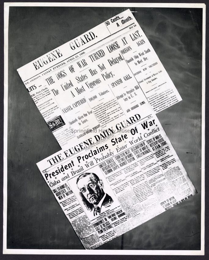 B&W Photo of two Newspaper Articles (1) from Eugene Guard Friday April 22, 1898."The Dogs of War Turned Loose at Last. The United States has not Delayed. A Most Vigorous Policy."