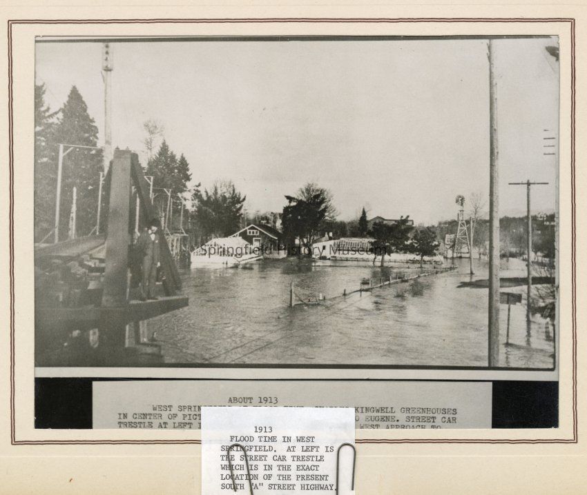 West Springfield at Flood Time. Charles Kingwell Greenhouses in center of Picture. Fence Marks the highway to Eugene, Oregon.Collection