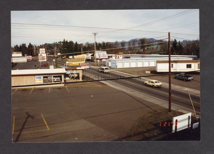 Color photograph from railroad trestle looking north, Kelly Butte in background (current Bring location at left). Burkett's Trailer Sales, Canned Goods Grocery Outlet, and Six States Distributors on left, Budget storage on right, green steel bridge over Willamette on far right, Coburg Hills in background.Collection