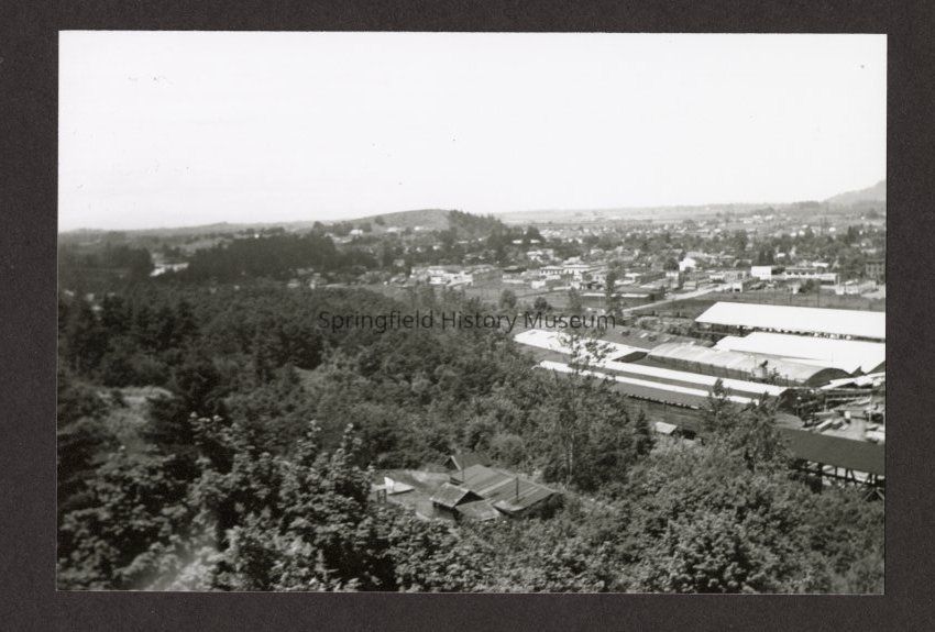 Photograph from Willamette Heights looking down on mill located at south end of Fifth street, Springfield. Probably taken before 1940