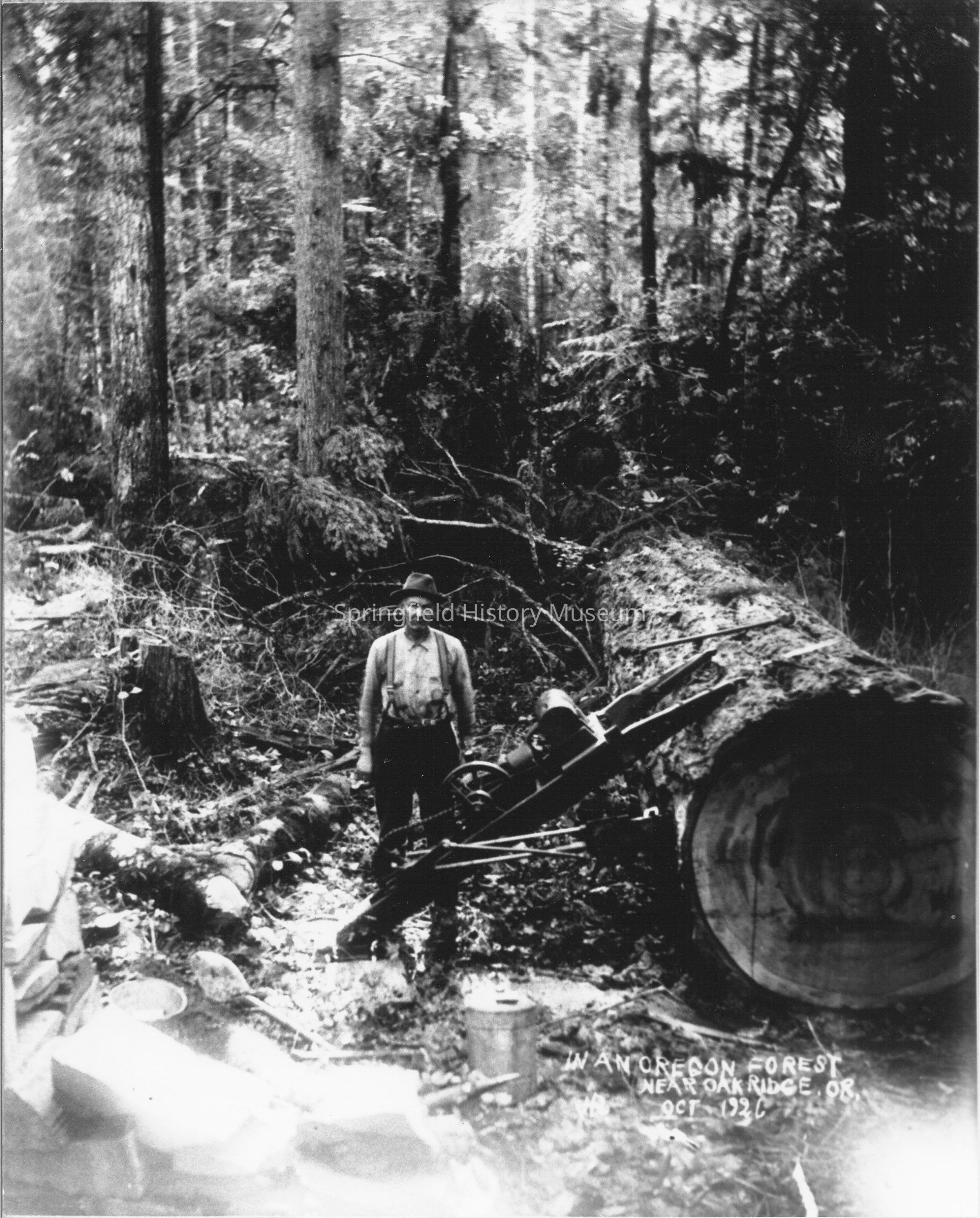 George Veatch with his drag saw, in an Oregon forest near Oakridge; Oct. 1926. Note on back says this is a copy from the Willamette National Forest Archives; permission from Gerald Williams.