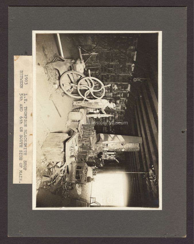 Photograph of the interior of the L.E. Thompson Blacksmith Shop, located between 5th and 6th on the south side of Main Street. Dated 1903. Photo is mounted on cardboard, with label reading "1903 L.E. Thompson Blacksmith Shop Between 5th and 6th on South Side of Main."