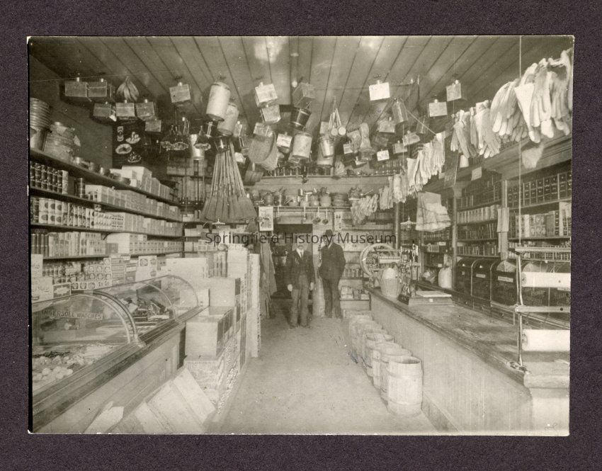 B&W Photo of inside a store with two men standing in the back.