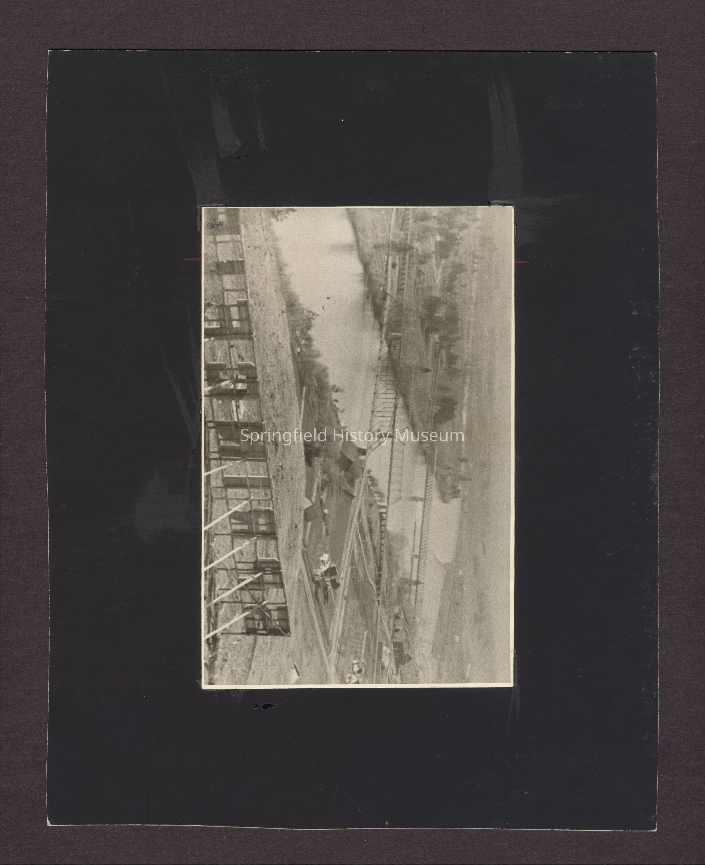 B&W photo mounted on poster board. View of Springfield, Oregon from behind the Springfield sign on Willamette Heights with three bridges over river and the grist mill.