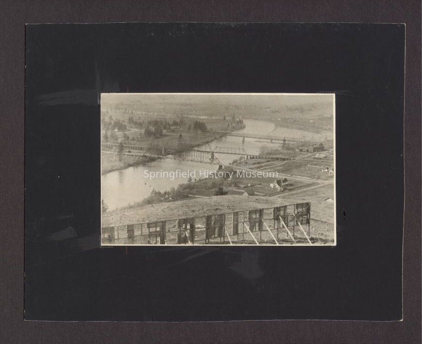 Photograph mounted on poster board. View of Springfield, Oregon from behind the Springfield sign on Willamette. Date unknown.Entry/Object ID