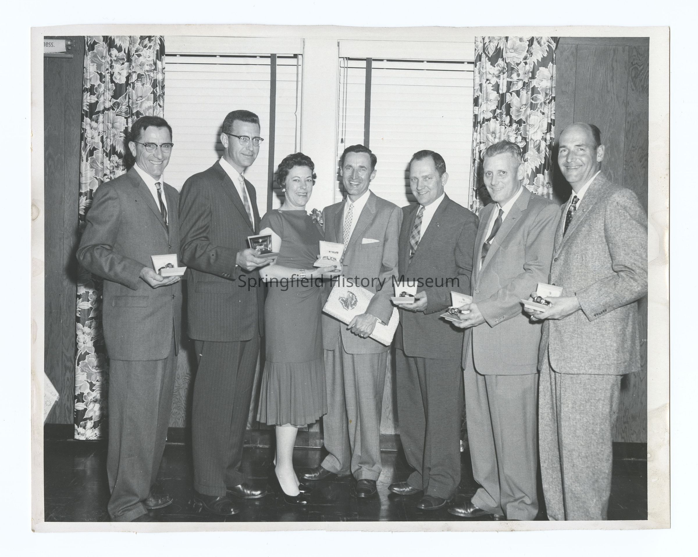 Photograph of 10th Anniversary of Springfield Motors, 1959. Inscription back: "Taken at 1959 Anniversary Banquet, 10 year employees. Left to right: George Allison, Frank Anderson, Mildred Wildman, Clarence Scherer Manager, Galen Caldwell, Robert Gilliland, Don Briody.