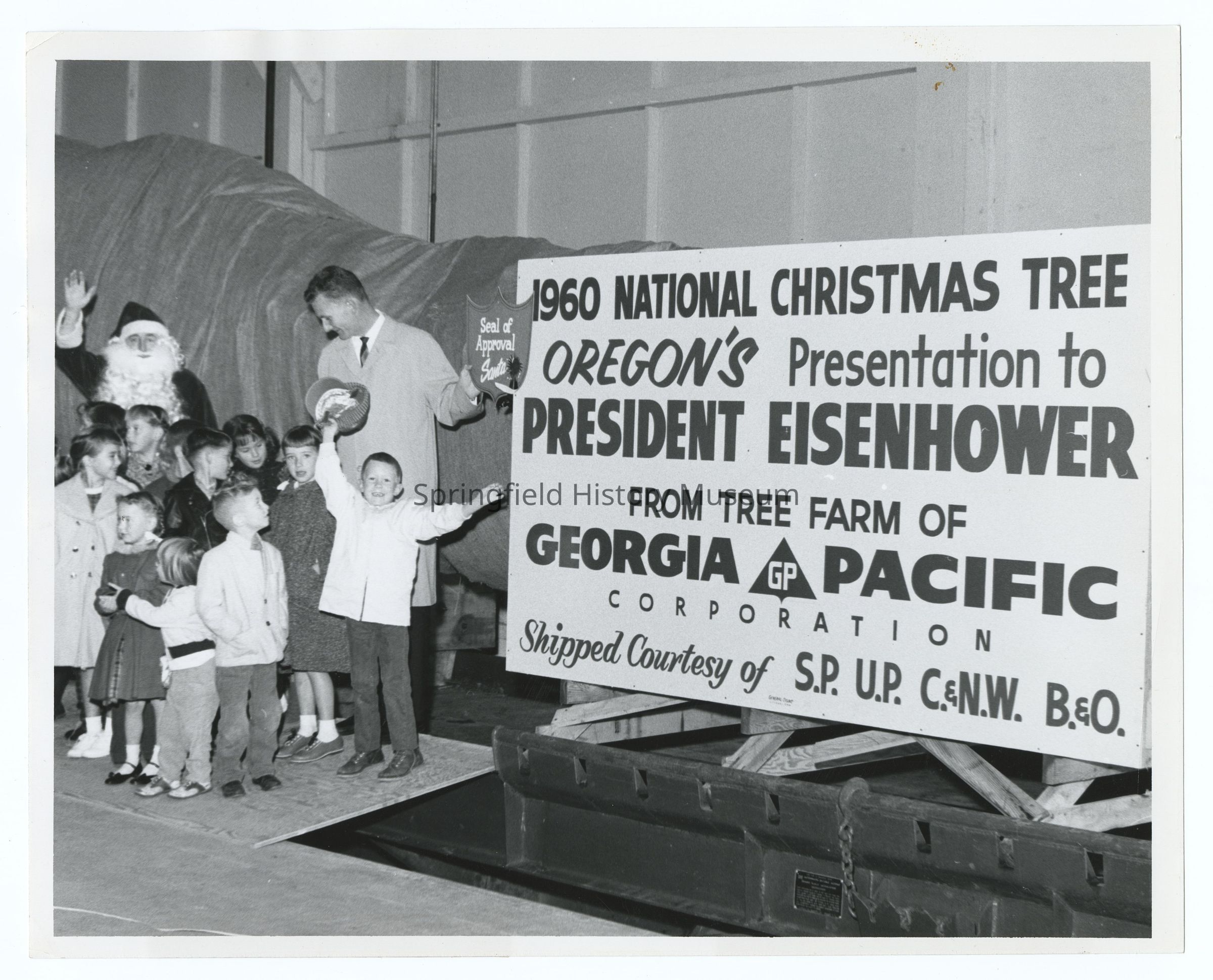 Photograph of 1960 National Christmas Tree, Oregon's Presentation to President Eisenhower from tree farm of Georgia Pacific Corporation, Shipped courtesy of S.P. U.P. C. & N.W. B.&O.Photograph Details