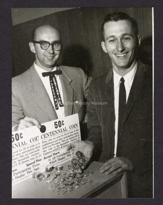 B&W Photo of 2 unknown men displaying Oregon Centennial coins (50 cents). One man is wearing an "Oregon Centennial" tie.Collection