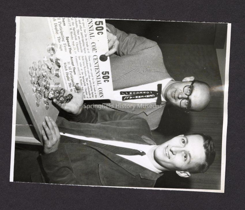 B&W Photo of 2 unknown men selling Oregon Centennial Coin 50 cents.Collection