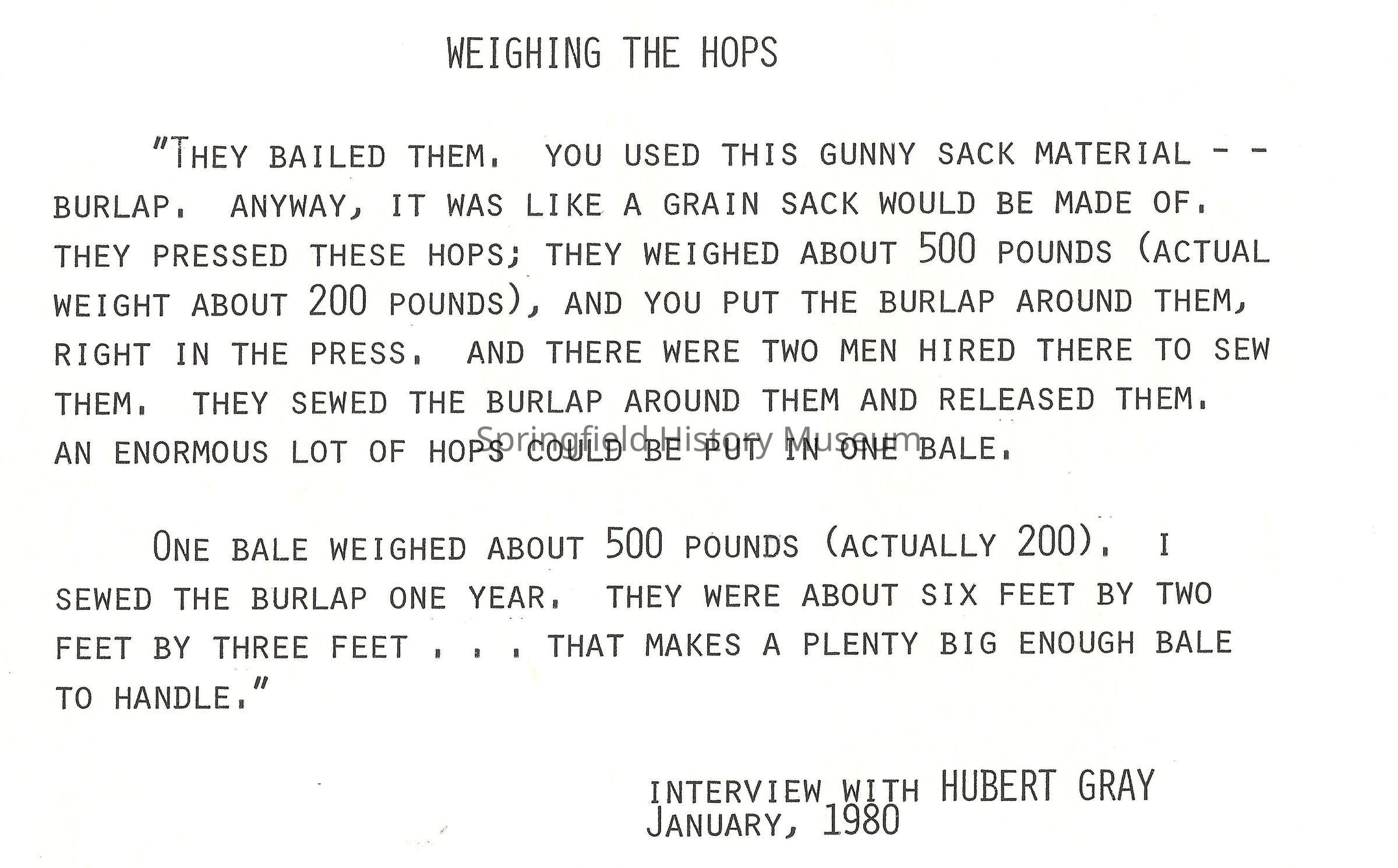 "They Bailed them, you used this Gunny Sack Material Burlap, Anyway, It was like Grain sack would be made of, they pressed these Hops; They weighed about 500 pounds (actual Weight about 200 Pounds), and you put the burlap around them, right in the press. And there were two men hired there to sew them. They sewed the burlap around them and released them, an enormous lot of the hops could be put in one bale,