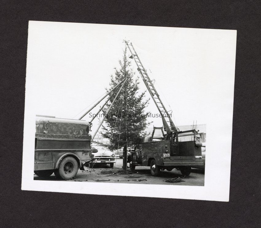 B&W Photo of two utility trucks working on a pine tree.Collection