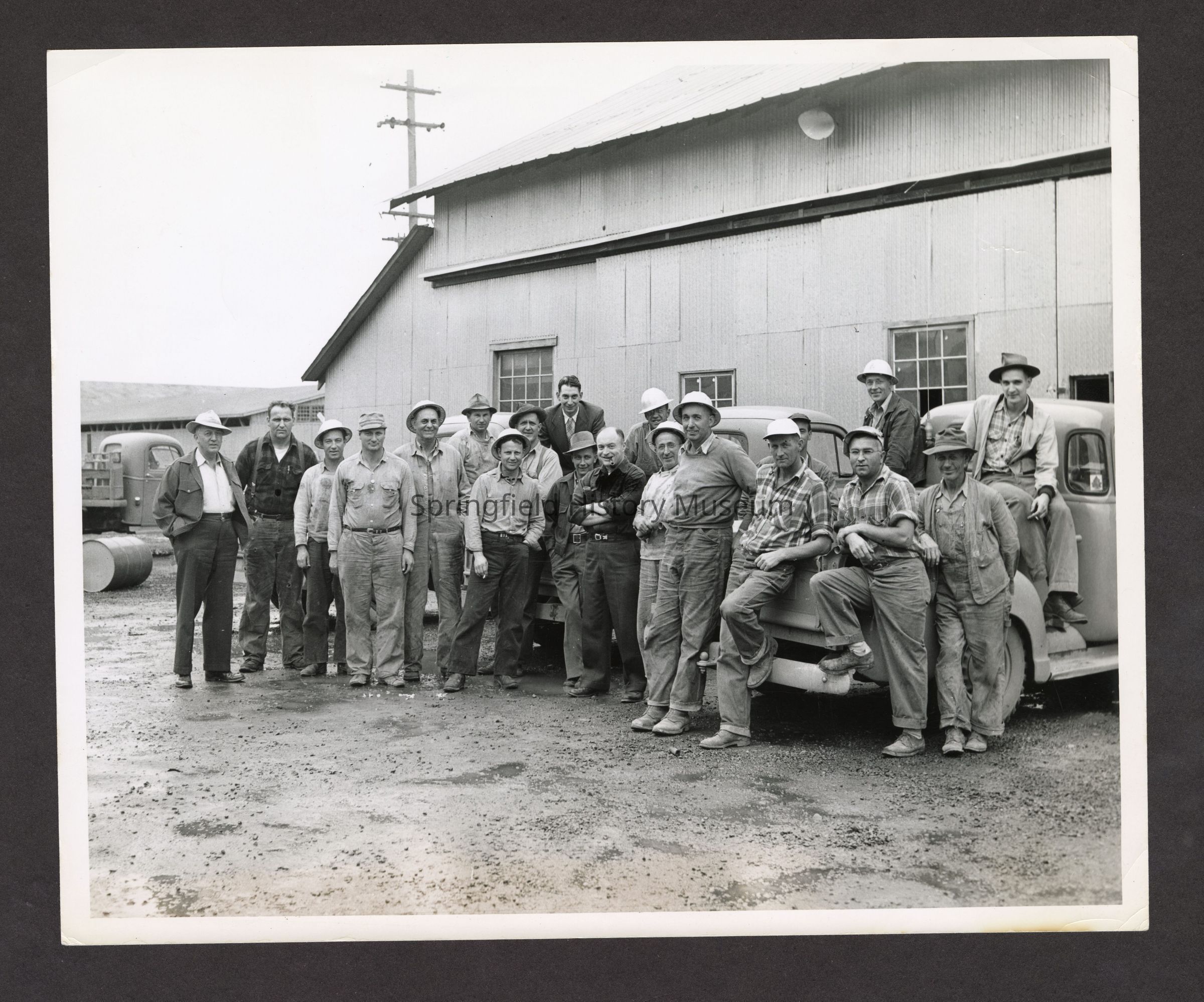 Photograph of 20 Workers standing outside of Booth-Kelly Lumber Mill, Springfield, Oregon, undated
