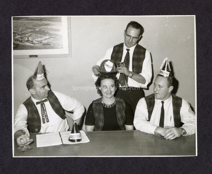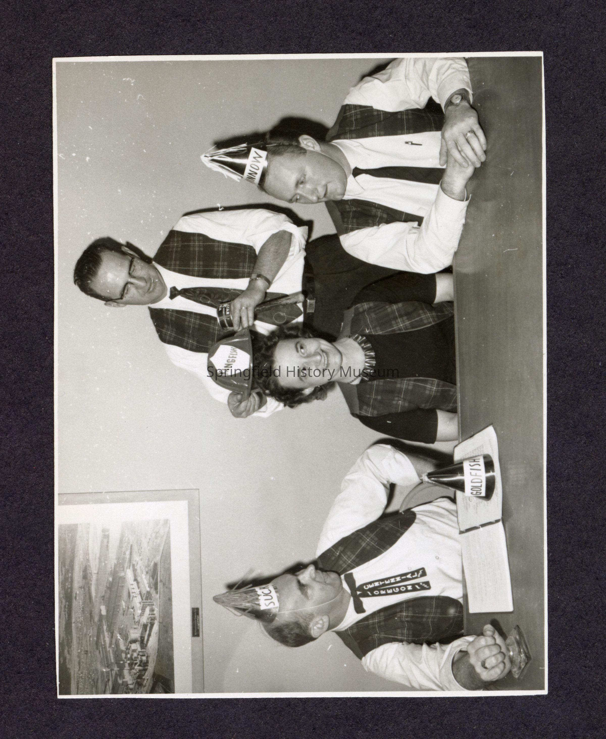 B&W Photo of 4 unknown people, all wearing matching plaid vests. A man is placing a plastic mock-sheriff hat labeled "Kingfish" on a grinning woman's head. On her left is a man wearing an Oregon Centennial 1959 tie and a conical party hat labeled "Suck[er?]"; on her right, a man wearing a conical party hat labeled "Minnow." A third conical party hat with "Goldfish" written on it rests on a notebook on the woman's left.Collection