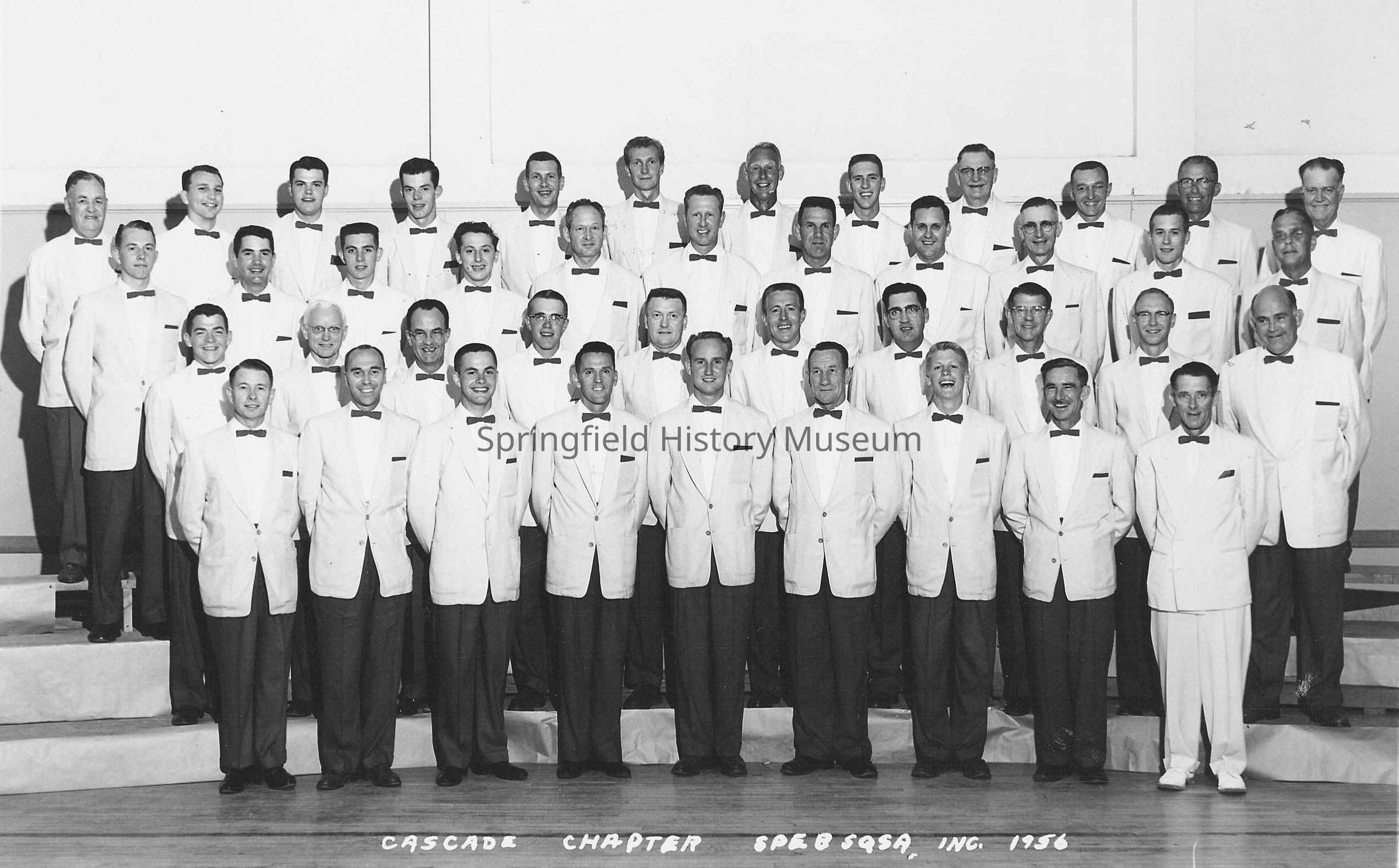 Photograph of Cascade Chapter of SPESQSA, 1956. Forty-two men in white jackets and bow ties.