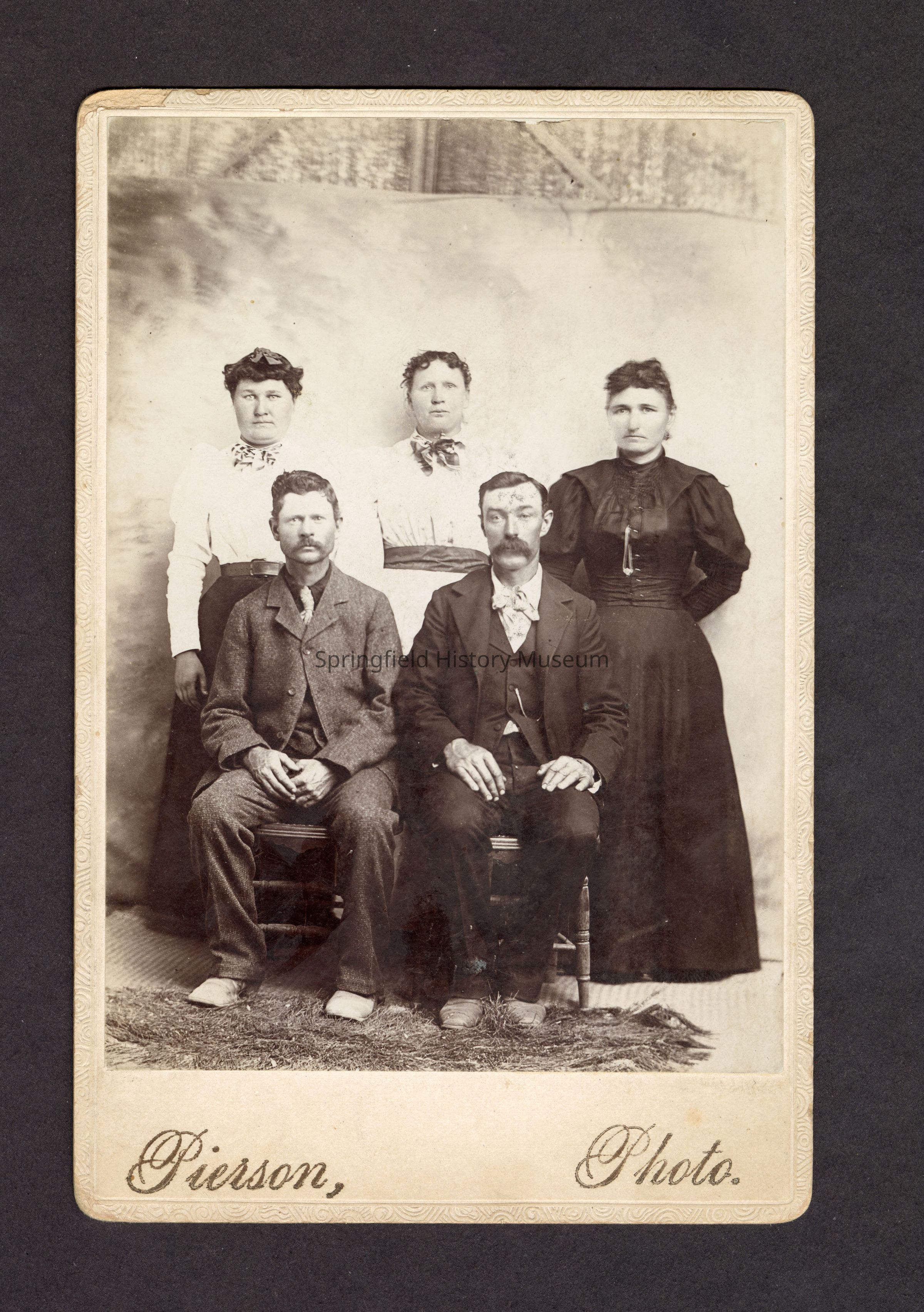 Photograph of 5 unknown people from Pierson Photo, on back: "Marion Taylor, this belongs to Fred"