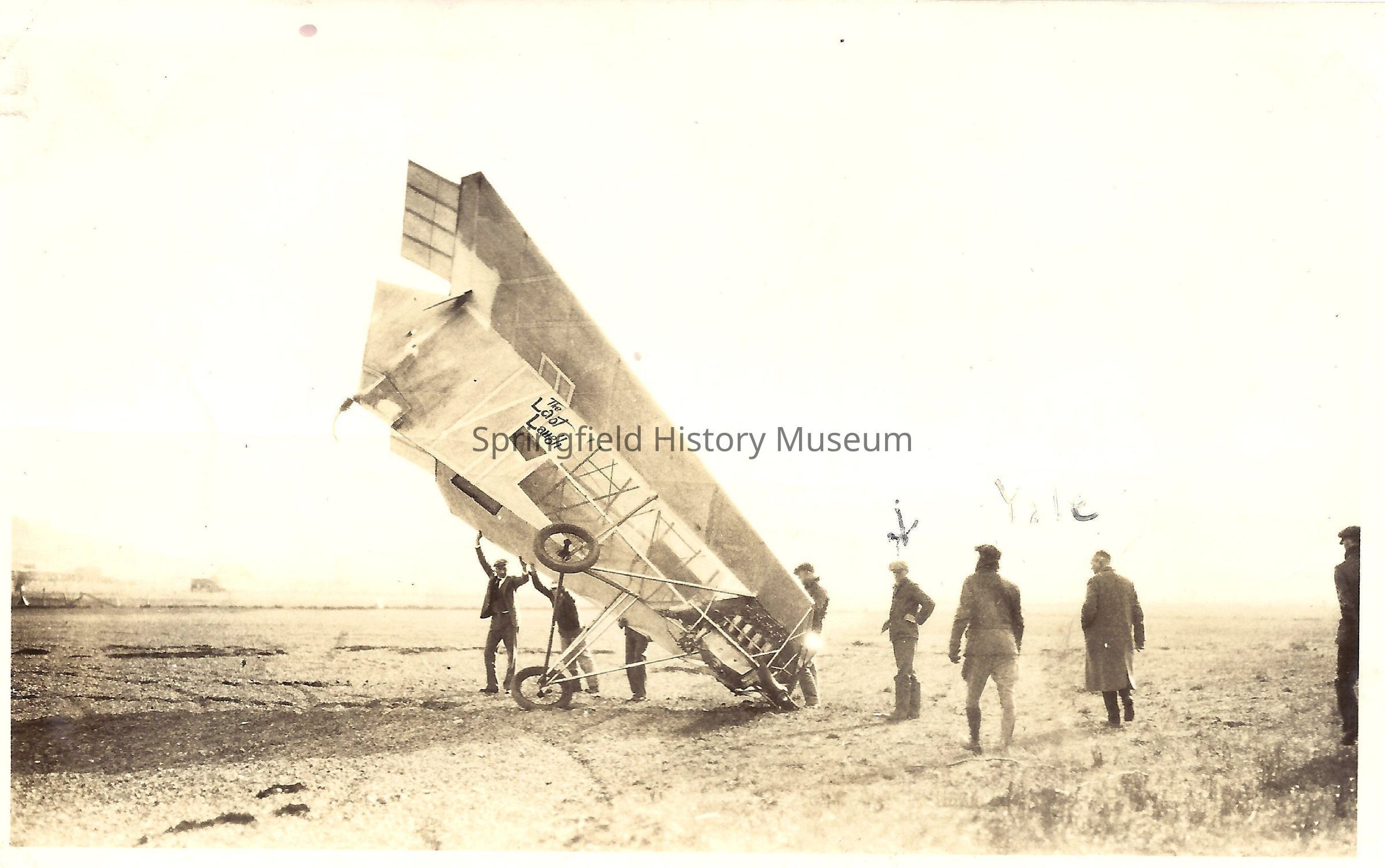 Photograph of 7 unknown men around an early aircraft called "The Last Laugh"
