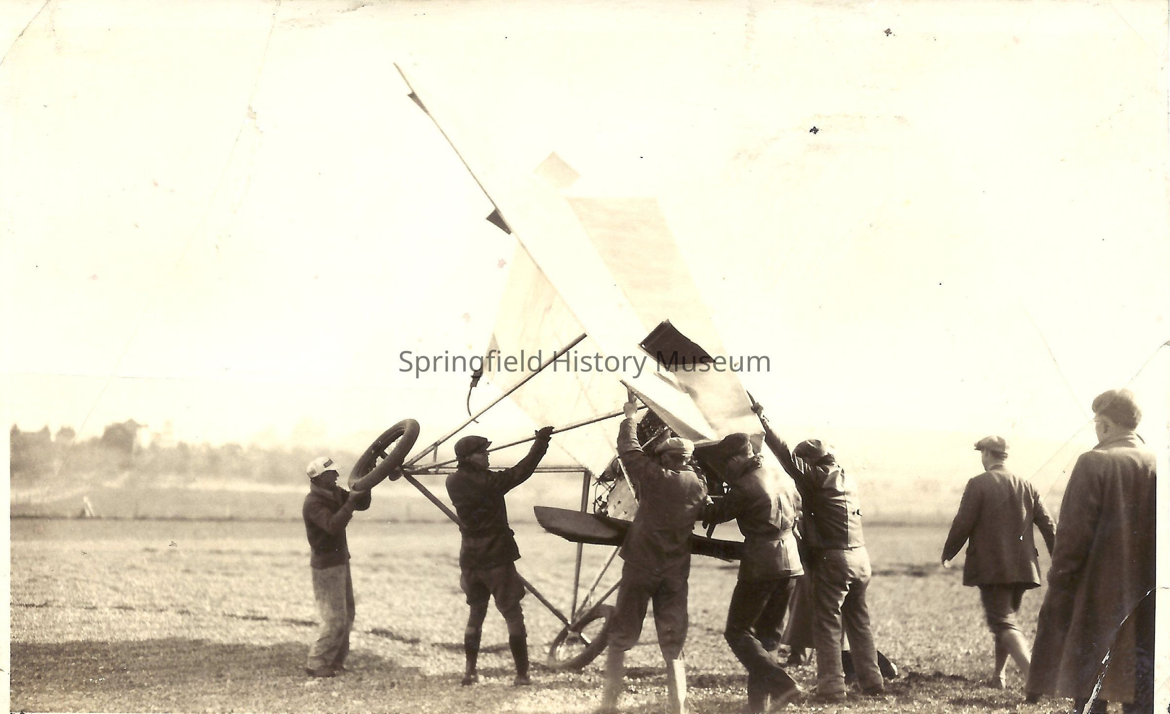 Photograph of 7 unknown men around an early aircraft, "The Last Laugh", undated