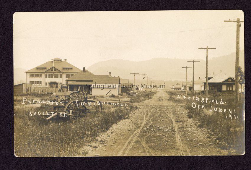 Post Card of Springfield, Oregon June 21, 1911, 7th Street Permanent improvement. Large building at left is Lincoln School, built 1910.Collection