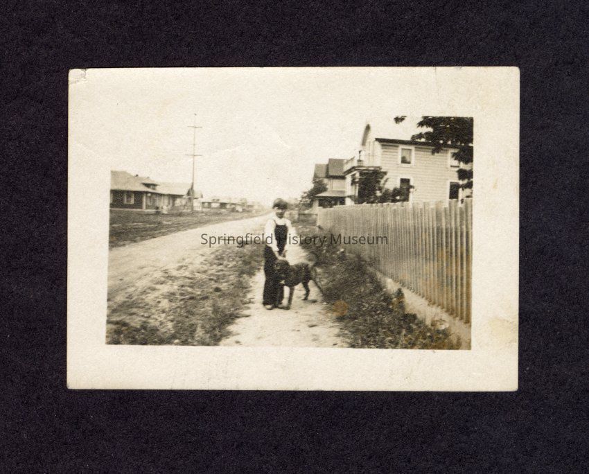 Photograph of a boy and a dog on a sidewalk, undated