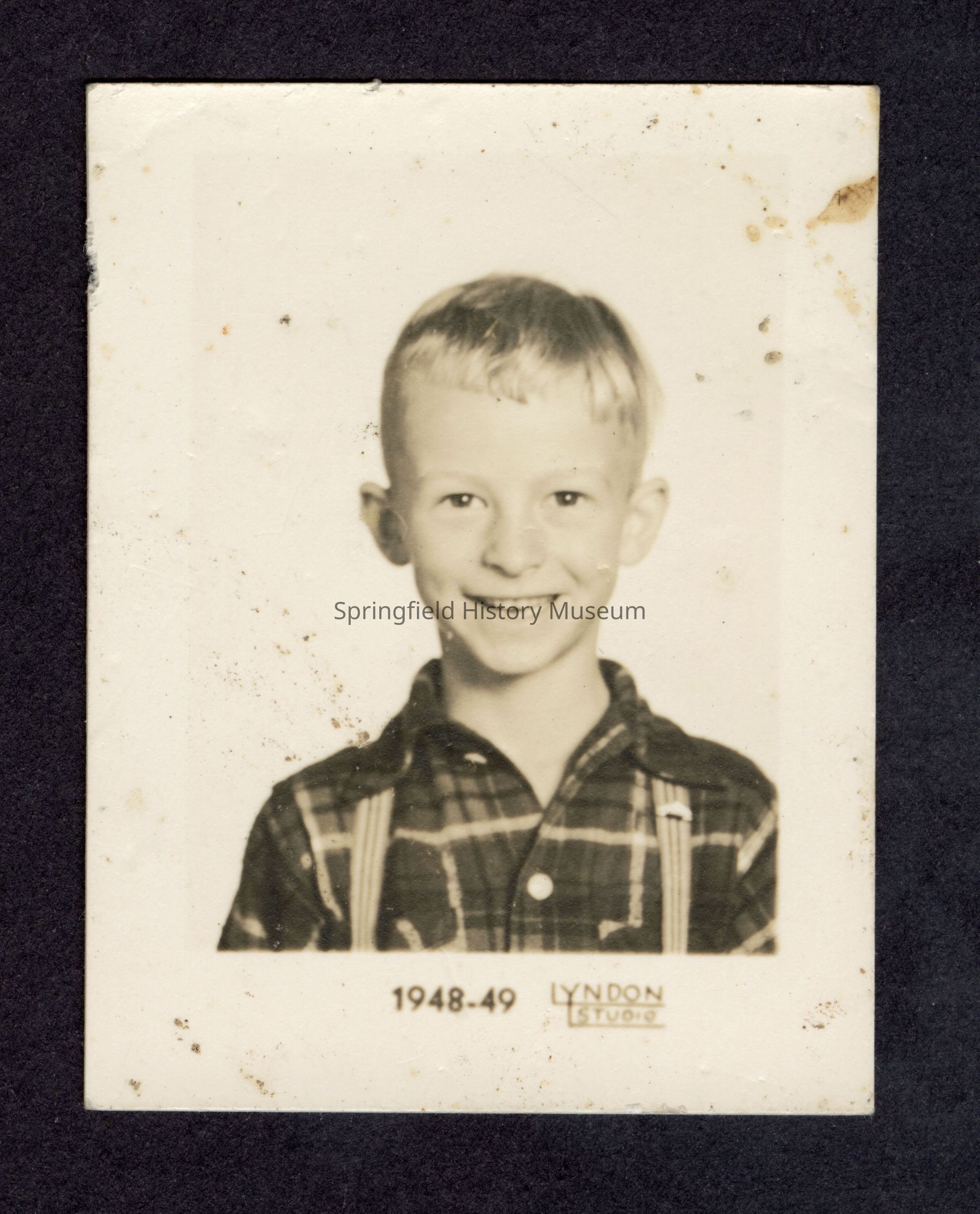 Photograph of a boy, circa 1949. Printed on front, "1948-49 Lyndon Studio."