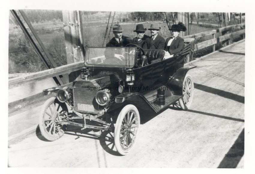 Photograph of Smith Mountjoy, with his brother Walter and their parents in a car on the Springfield wooden bridge in 1915.Photograph Details