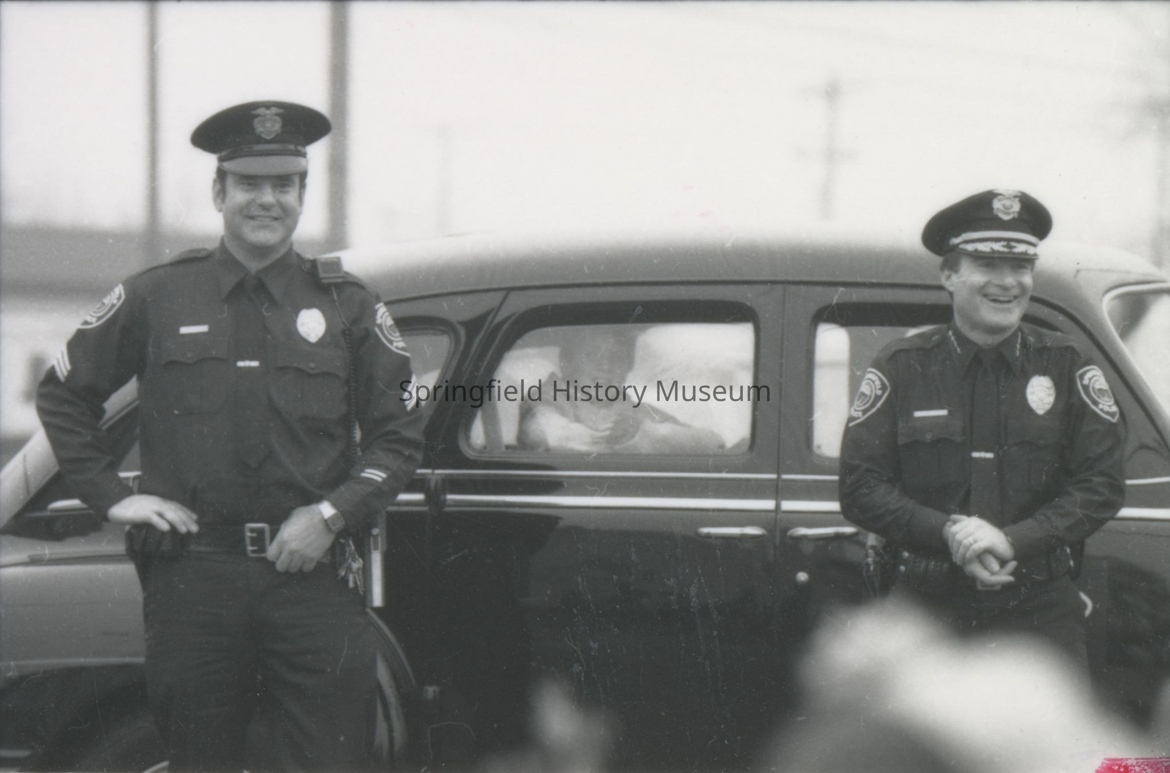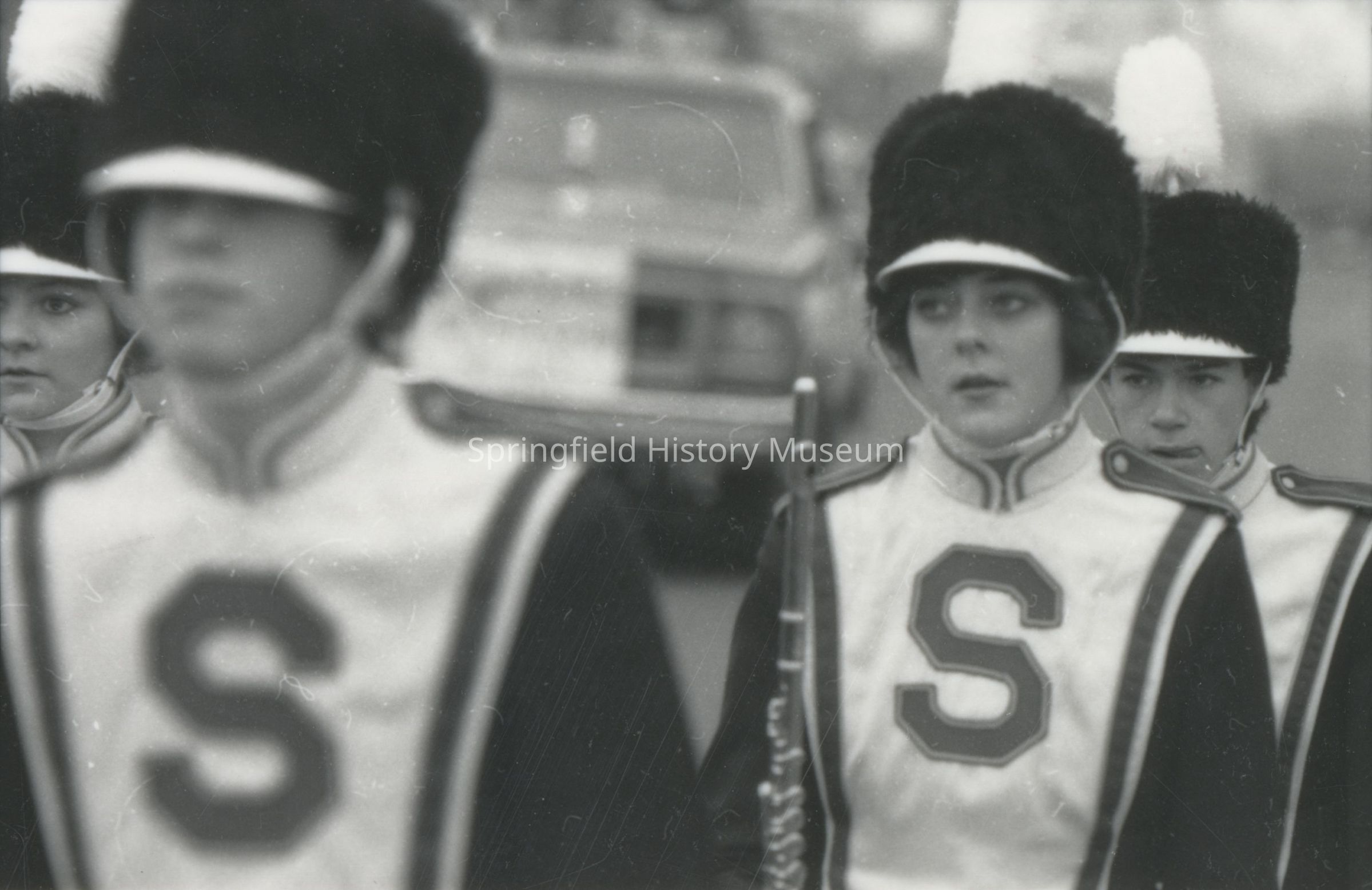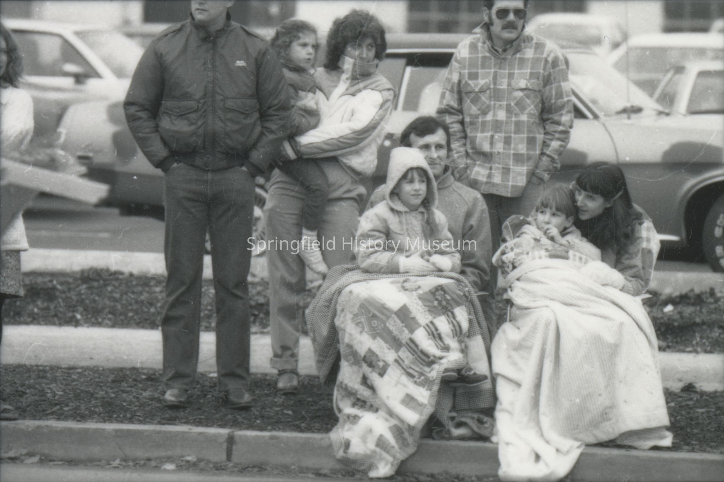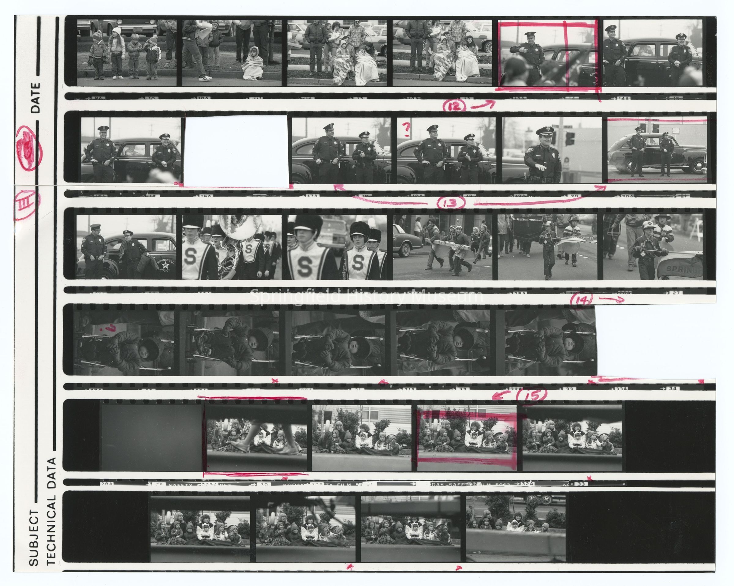 Photograph overview of a Christmas parade, Springfield, circa 1980, undated. Shows: Springfield Marching Band, Springfield Police Department, spectators.