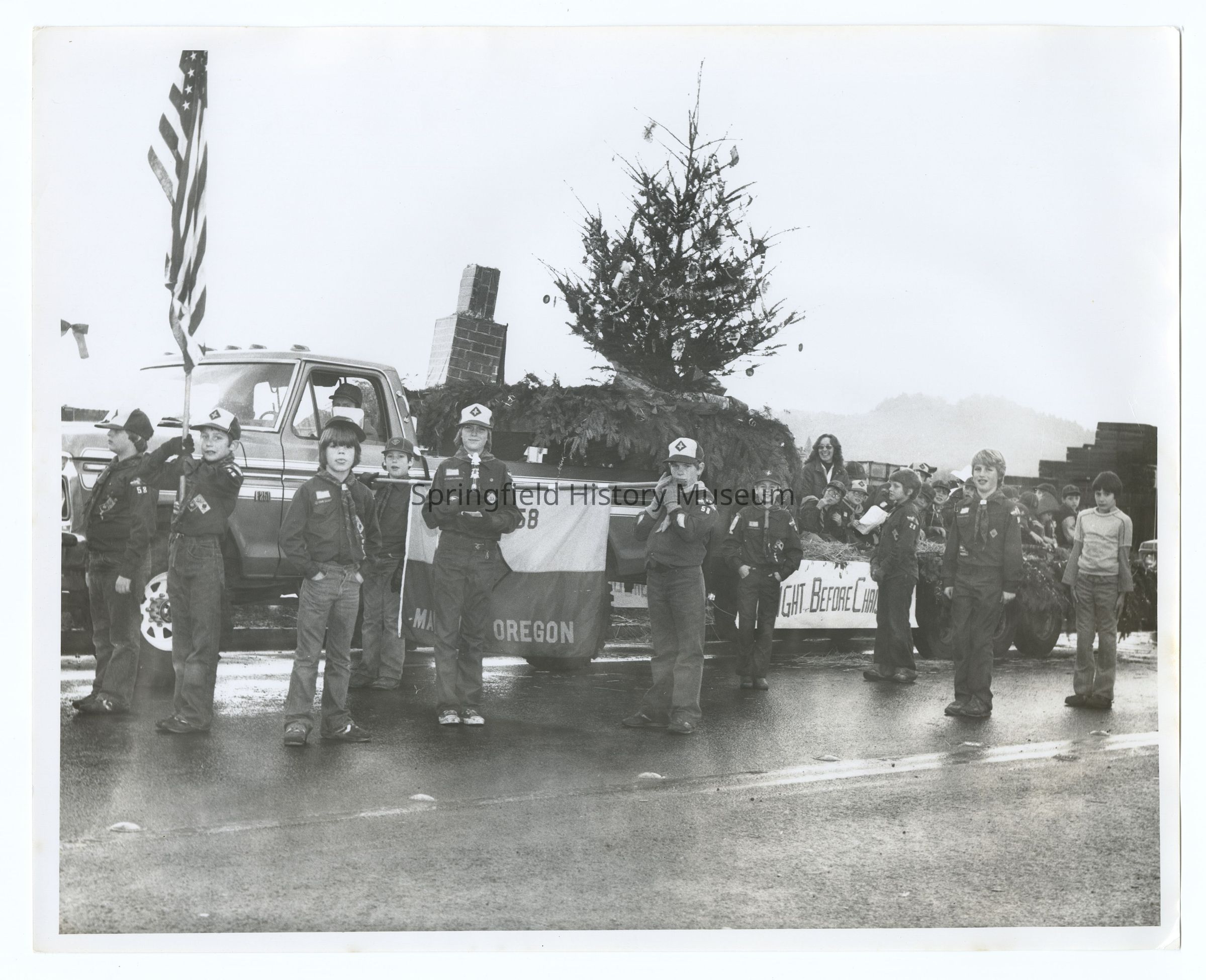 Photograph of a Christmas parade, Springfield, circa 1980, undated. Boy Scouts.Photograph Details