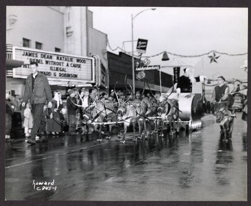 Photograph of Springfield Christmas Parade, circa 1950s. Reindeer pulling a sleigh with Santa Claus.Photograph Details