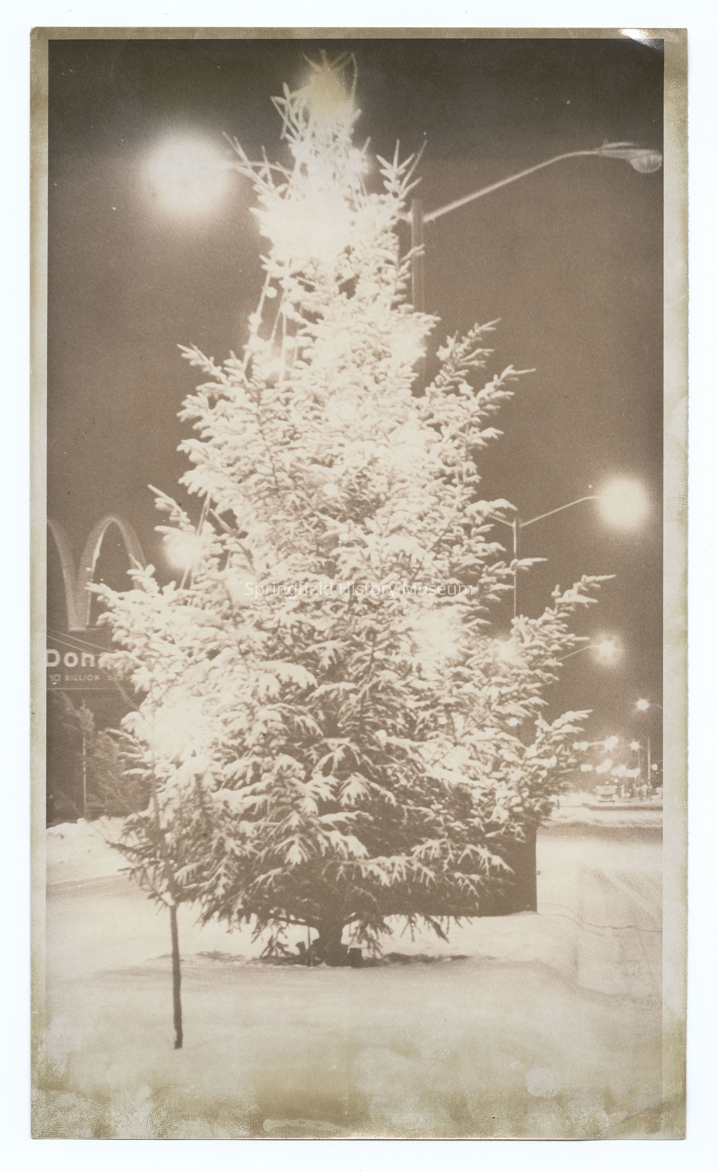 Photograph of a Christmas tree and street covered in snow, Springfield, undated, circa 1970.Photograph Details