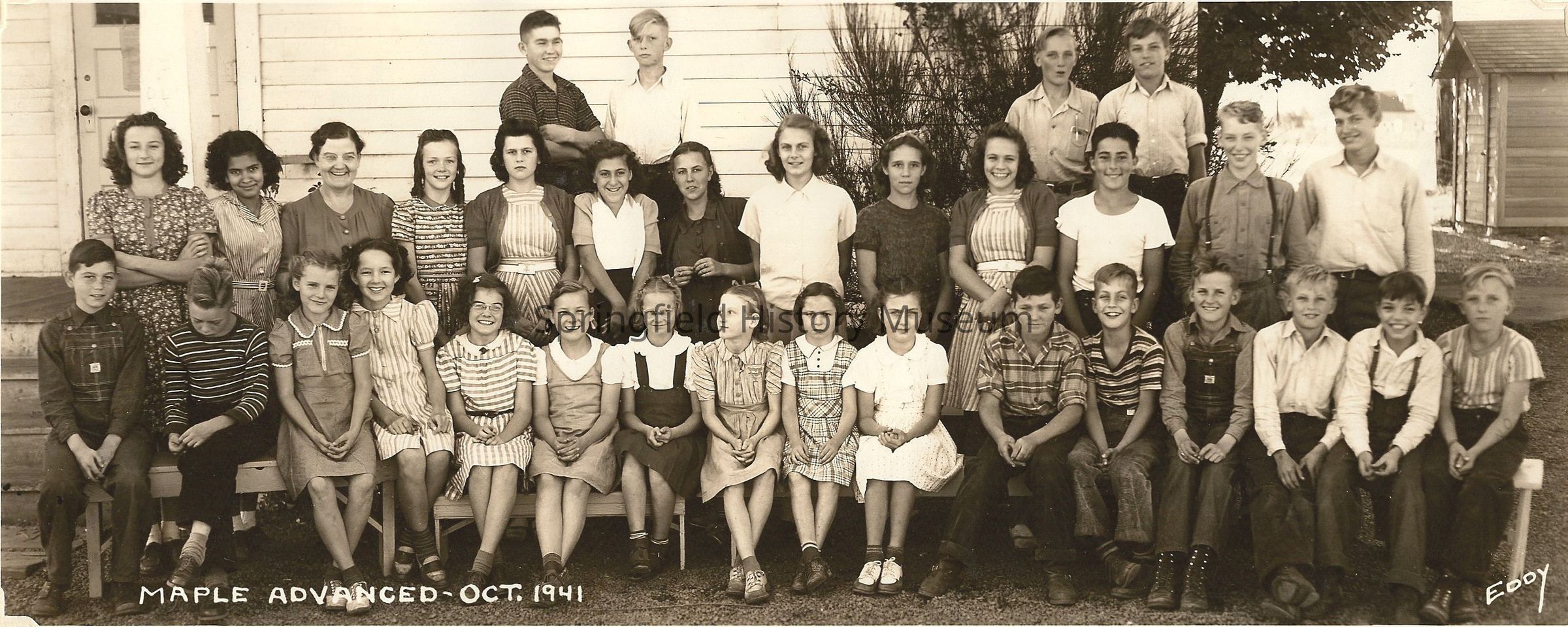 Maple School, 1941. Group of 32 students with their teacher. Ina Mae Hamilton is the eighth student from the left. Original location of school now the Rosboro office. Corner of photo is marked Eddy, possibly the photo studio.