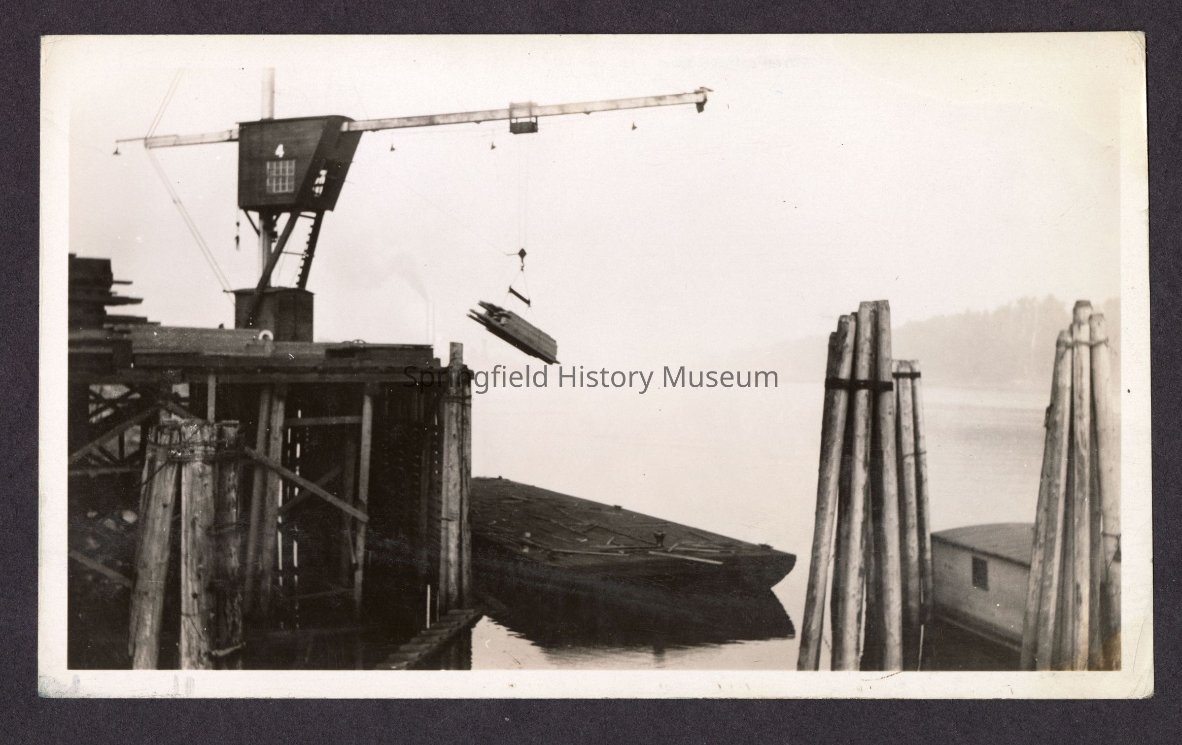 Photograph of a crane lifting lumber onto a barge, date unknown same as 2016.008.197
