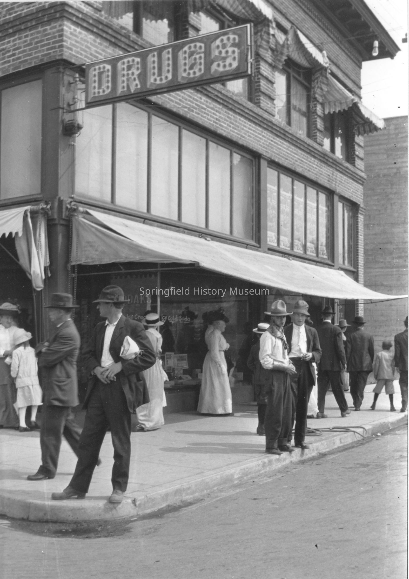 Street Views, Drugstore, Sutton Block, Main Street, Downtown, Street View, Springfield--Main Street--Sutton Block, Springfield--Street Views, Buildings--Drugstore, Business & Industry--Drugstore, People--Groups & IndividualsDimensions