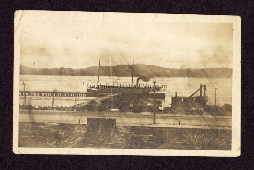 Freighter at dock near wood yard; possibly Oregon Coast or Mapleton [handwritten survey notes on Springfield extension originally in with this photograph]