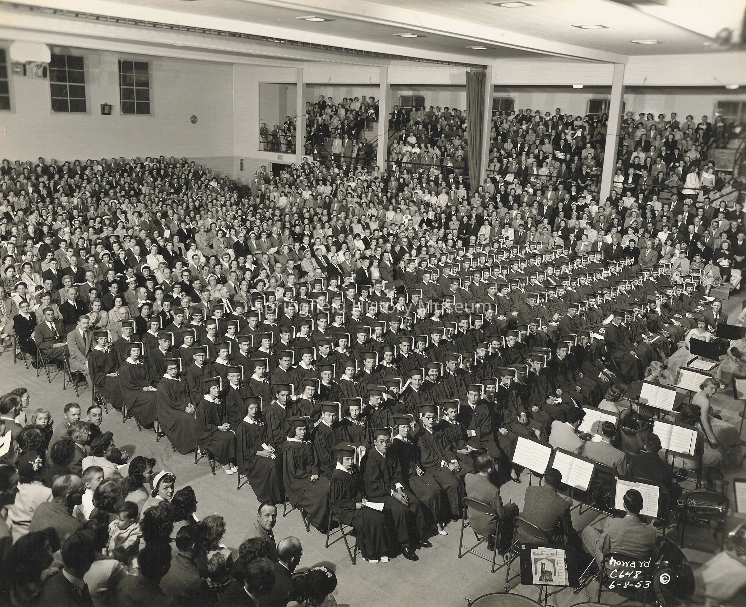 Overview of graduating class and guests in gym, 6/8/1953, 2 copies (Howard c648 - C)