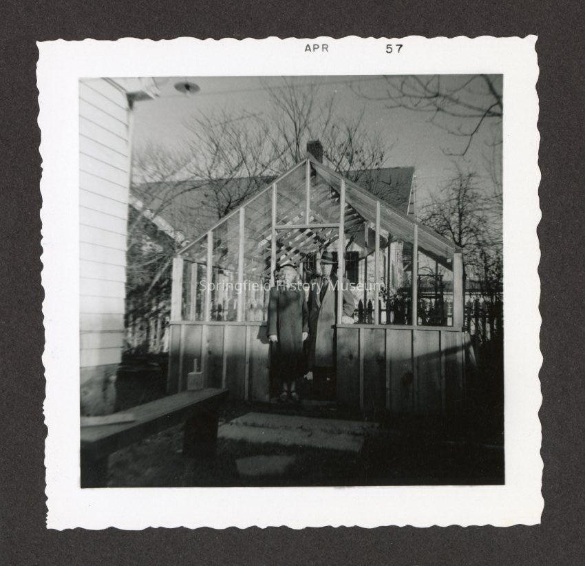 B&W Photo of unknown woman and man standing in front of a greenhouse, April 1957.Collection