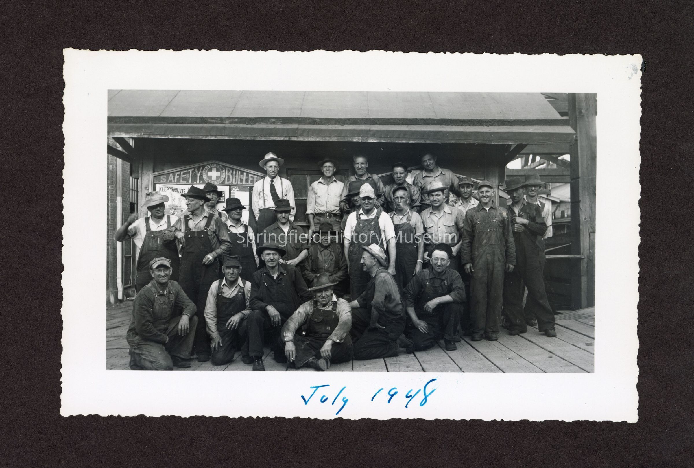Photograph of a group of 25 unknown men infront of safety bulletin board, "July 1948" at Booth-Kelly Lumber Mill