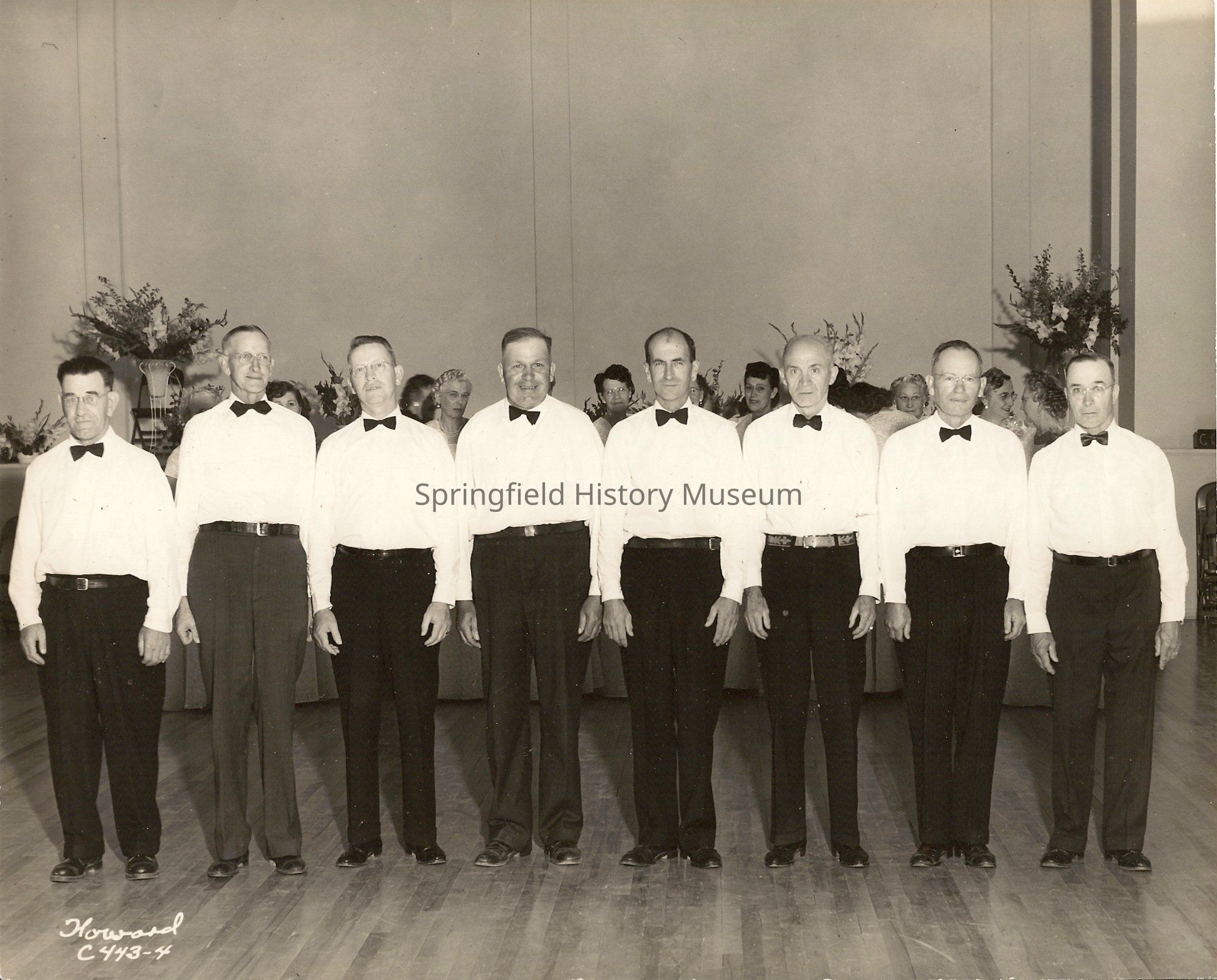 Photo of a group of 8 men in white shirts and bowties, a group of ladies in background. August 1951