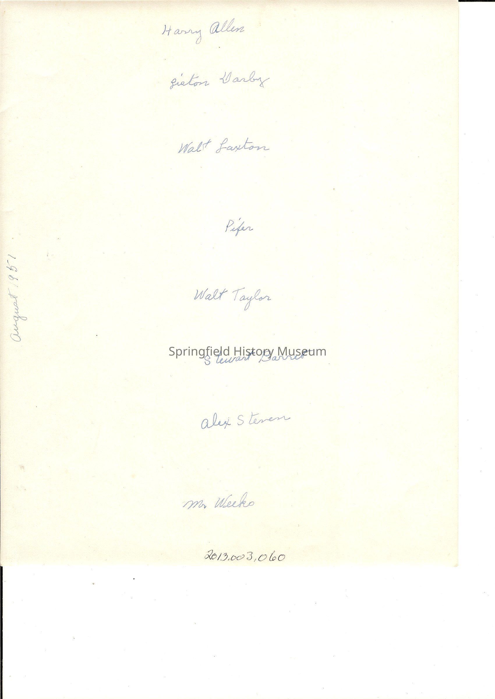 Names of men: Harry Allen, Liston Darby, Walt Laxton, Pifer, Walt Tayor, Stewart Barret, Alex Steven, Mr. Weeks,Made/Created