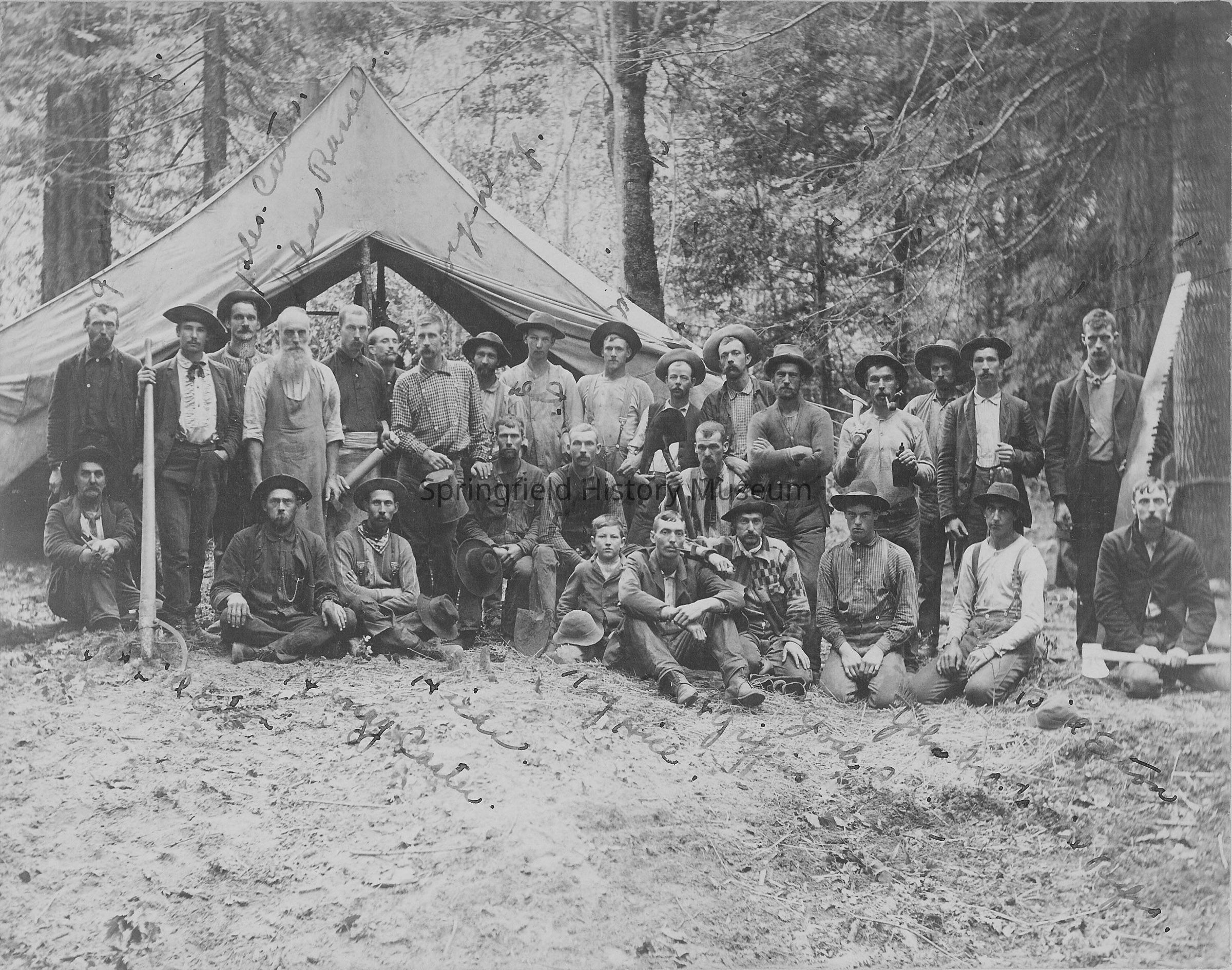 Group of loggers in front of a tent, handwritten identification of some of the loggers on the front. Mounted on a board, no date.